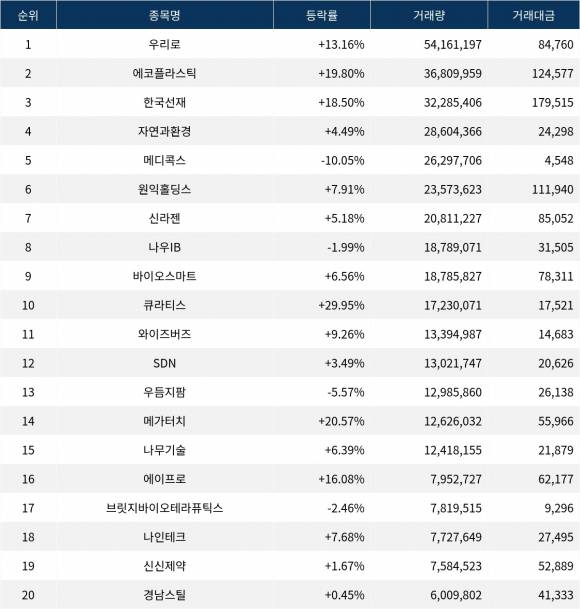 한편 거래량 상위 20위권 종목들은 와이즈버즈(273060) ▲9.26%, SDN(099220) ▲3.49%, 우듬지팜(403490) ▼5.57%, 메가터치(446540) ▲20.57%, 나무기술(242040) ▲6.39%, 에이프로(262260) ▲16.08%, 브릿지바이오테라퓨틱스(288330) ▼2.46%, 나인테크(267320) ▲7.68%, 신신제약(002800) ▲1.67%, 경남스틸(039240) ▲0.45% 등의 성적을 기록하고 있다.