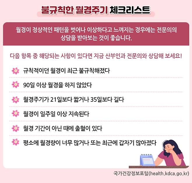 월경 패턴이 평소와 달라 이상하다고 느껴진다면, 전문의와 상담해 보는 것이 좋습니다. 다음 체크리스트 항목 중 해당하는 사항이 있다면 지금 바로 상담해 보세요!
