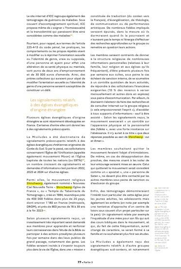 "최근 프랑스에서는 여러 외국계 복음주의 교회가 성장해 왔다. 이 중 일부 교회에서 우려스러운 신고 사례가 발생했는데 특히 한국계 기독교 복음주의 교회에 관한 신고들이 있었다. 과거에는 통일교와 (파리)열방교회에 대한 내용이 주를 이뤘으나, 2023년과 2024년 들어 다른 교회에 대한 신고와 정보 요청이 증가했다."