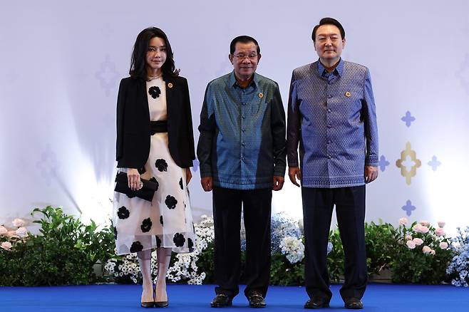| ▲ 윤석열 대통령과 김건희 여사가 지난 2022년 11월 12일 캄보디아 프놈펜 쯔노이짱바 국제 컨벤션 센터에서 열린 캄보디아 주최 갈라 만찬에서 훈센 캄보디아 총리와 기념 촬영하고 있다. |