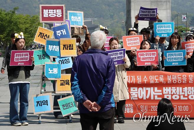 | ▲ "불평등 문제 해결이 진정한 민주주의 완성" 불평등 물어가는 범청년행동 주최로 25일 오전 서울 종로구 광화문광장에서 열린 '불평등 물어가는 범청년행동 전환 출범 기자회견-다음 페이지가 될 수 있도록, 불평등을 물어갑니다'에서 참석자들이 22대 대통령 선거에서 주목해야 할 청년 의제와 광장 안팎의 청년들이 바라는 사회를 만드는 활동 계획 등을 발표하고 있다. 기자회견 참석자들은 "그동안 내란사태에 맞서 청년의제를 모았다면, 이제는 일상 곳곳의 불평등을 종식하고 평등한 민주사회를 요구하고자 한다"며 "불평등 문제 해결이야 말로 진정한 민주주의 완성이라는 것을 조기대선 국면에서 알려낼 것"이라고 밝혔다. 이들은 또한 불평등 사다리 무너뜨리기 퍼포먼스를 하며 "청년들이 자산, 노동, 기후, 주거, 젠더, 지역, 교육, 자립, 부채, 다양성 등 각 분야에서 겪는 불평등에 짓눌려 바닥에 쓰러져있었지만, 불평등을 물어가는 호랑이와 함께 대를 잇는 불평등의 사다리를 무너뜨리겠다"는 의지를 표현했다. |