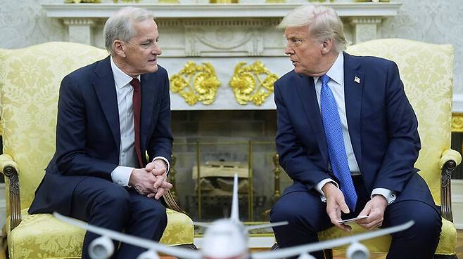 ▲ 24일 백악관에서 정상회담 하고 있는 도널드 트럼프 미국 대통령(오른쪽)과 요나스 가르 스퇴르 노르웨이 총리(왼쪽)