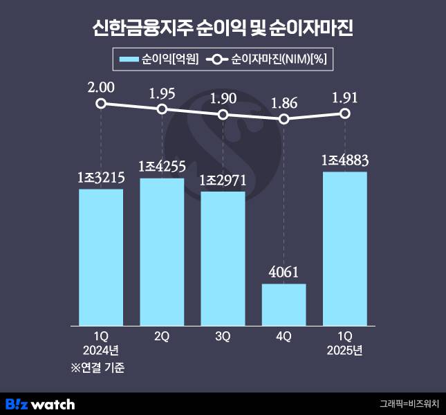 신한금융지주의 올해 1분기(1~3월) 연결재무제표 기준 당기순이익이 전년 같은 기간보다 약 13% 순증했다. 시장금리 하락에도 대출규모를 키우면서 안정적으로 영업을 이어간 영향이다. 작년 1분기 발생한 홍콩H지수 주가연계증권(ELS) 피해 보상 일회성 악재를 털어낸 점도 영향을 미친 것으로 풀이된다.