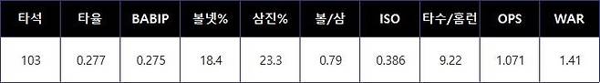 게다가 주력도 빠르다. 2024년 1초당 27.8피트(약 8.47m)로 올시즌 메이저리그에서 좋은 활약을 보이고 있는 이정후(27.9피트)와 비슷한 수준이다. 발이 느린 거포와는 결이 다른 유형이다.