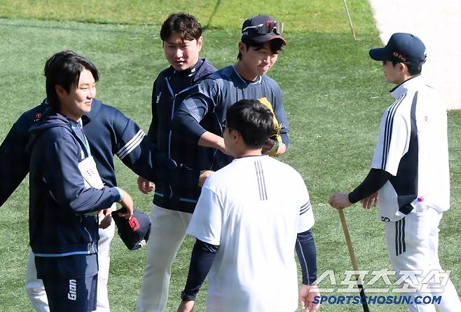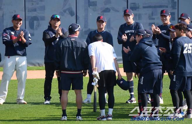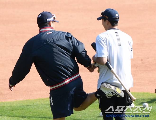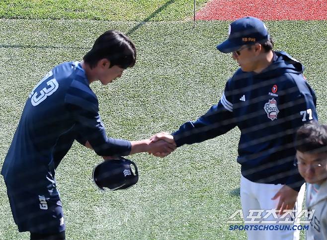훈련이 끝났지만 이승엽 감독이 아직 그라운드에 남아 있었다. 전민재와 정철원을 기다린 듯했다. 전민재가 연신 허리를 숙여 인사하며 달려왔다. 이승엽 감독과 정중하게 악수했다.