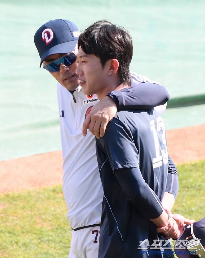 정철원이 장난기 넘치는 미소를 지으며 두산 선수단을 찾았다. 코칭스태프들이 정철원의 뺨과 머리를 만지며 안부를 물었다. 곧이어 전민재도 등장했다.