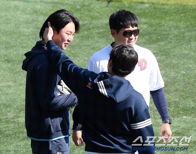 전민재를 아끼던 조성환 코치가 어깨에 팔을 두른 채 전민재와 한참을 대화 나눴다. 더이상 한 팀은 아니지만 제자의 활약과 트레이드 성공을 진심으로 축하하는 모습이다. 정철원과 전민재가 인사 나누는 사이 다른 한쪽에서는 또다른 만남이 준비됐다.