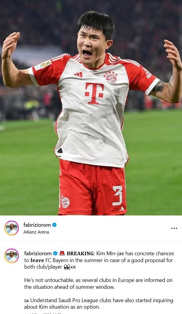 로마노는 지난 21일에도 자신의 인스타그램에 “김민재가 올여름 뮌헨과 결별할 가능성이 있다”며 이적을 점쳤다.