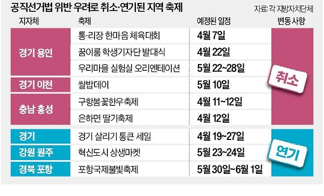 행사 연기 사례도 속출하고 있다. 경기도가 ‘2025년 경기 살리기 통큰 세일’을, 강원 원주시가 ‘2025 혁신도시 상생마켓’ 등을 최근 연기하기로 결정한 것도 선거법을 의식해서다. 경북 포항시는 ‘2025 포항국제불빛축제’를 6월 말로 연기했다. 충북 등에선 축제가 아니라 주민 민원 수렴 차원의 행정 활동인 도정 설명회까지 연기됐다.