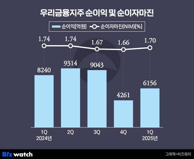 우리금융은 1분기 순이익이 전년 동기대비 25.3% 감소한 6156억원을 기록했다고 25일 공시했다. 대손관리 비용을 보수적으로 운영하는 가운데 올 1월 희망퇴직 실시로 퇴직 비용 1690억원 등이 반영된 영향이다.