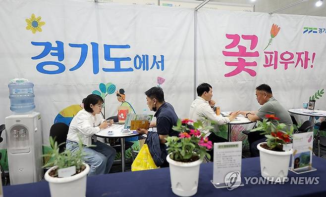 (수원=연합뉴스) 권준우 기자 = 25일 경기도 수원시 영통구 수원컨벤션센터에서 열린 스마트 귀농귀촌 지역살리기 박람회 'Y-팜 엑스포' 경기도귀농귀촌지원센터 부스에서 방문자들이 상담받고 있다. 2025.4.25