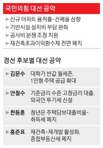 홍 전 시장은 △재건축·재개발을 통한 100만가구 공급 △종합부동산세 폐지 △청년층 대상 토지임대부 주택(토지는 공공이 소유하고 건물만 분양) 확대 등을 약속했다.