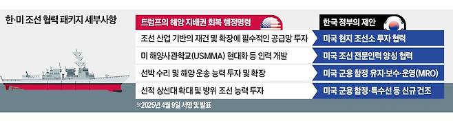 미국은 비상시 물자를 수송할 수 있는 민간 선박인 전략상선단과 군수지원함, 전투함 등의 건조를 추진 중이다. 전략상선단은 전시에만 동원할 수 있고, 전투함은 비밀 사항이 많아 한국과의 협력은 군수지원함 건조부터 시작하는 게 현실적이라는 평가가 나온다. 해당 선박을 지은 경험이 있는 HD현대와 한화오션의 특수선 독을 총동원하면 4~5척 ‘동시 건조’가 가능한 것으로 전해졌다.