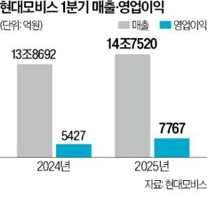 실속도 챙겼다. 현대모비스의 올 1분기 영업이익률은 5.3%로, 지난해 1분기(3.9%)보다 높아졌다. 현대모비스 관계자는 “고부가가치 제품인 전장 부품 공급 확대와 글로벌 AS 수요 증가, 우호적인 환율 환경(원·달러 환율 상승)이 더해져 영업이익이 크게 늘었다”고 설명했다.