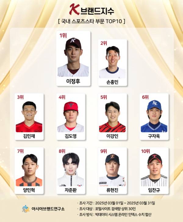 K-브랜드지수 스포츠스타 부문은 이정후가 1위에 등극했으며, 손흥민(2위), 김민재(3위), 김도영(4위), 이강인(5위), 구자욱(6위), 양민혁(7위), 차준환(8위), 류현진(9위), 임찬규(10위) 등이 TOP10에 이름을 올렸다.