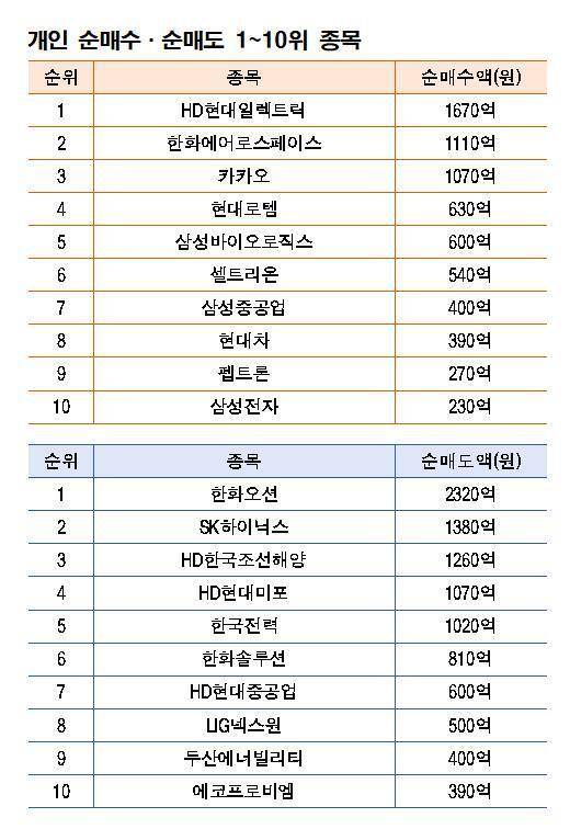 이번 주 개인 순매수 1위 종목은 HD현대일렉트릭이었다. 2~10위는 한화에어로스페이스, 카카오, 현대로템, 삼성바이오로직스, 셀트리온, 삼성중공업, 현대차, 펩트론, 삼성전자였다. 개인이 가장 많이 매도한 10개 종목은 한화오션, SK하이닉스, HD한국조선해양, HD현대미포, 한국전력, 한화솔루션, HD현대중공업, LIG넥스원, 두산에너빌리티, 에코프로비엠이었다.