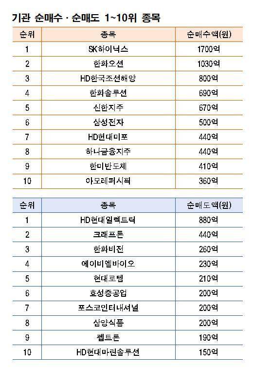 이번 주 기관의 순매수 1위 종목은 SK하이닉스였다. 2~10위는 한화오션, HD한국조선해양, 한화솔루션, 신한지주, 삼성전자, HD현대미포, 하나금융지주, 한미반도체, 아모레퍼시픽이었다. 기관이 가장 많이 매도한 10개 종목은 HD현대일렉트릭, 크래프톤, 한화비전, 에이비엘바이오, 현대로템, 효성중공업, 포스코인터내셔널, 삼양식품, 펩트론, HD현대마린솔루션이었다.