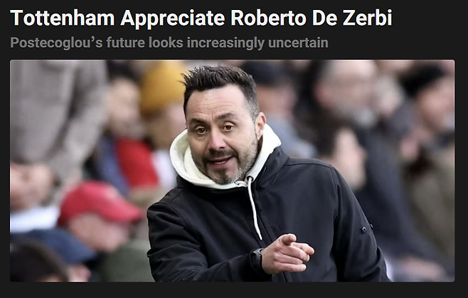 25일 영국 매체 '기브미 스포츠'는 "북런던 구단의 포스테코글루 감독이 해고되는 가운데 토트넘이 브라이턴의 전 감독인 데 제르비를 관찰하고 있다"고 밝혔다.