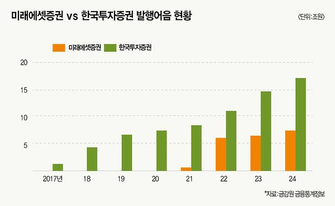 미래에셋증권은 지난해 말 기준 발행어음 조달 잔액이 7조4733억원으로 여유가 있다. 이는 발행어음 사업 진출 자체가 다소 늦은 탓으로 분석된다. 과거 2017년 미래에셋증권은 초대형 IB 지정을 받으며 발행어음 인가는 받지 못했다. 당시 한국투자증권만 인가를 받았고 미래에셋증권은 2021년에서야 인가를 받았다. 공정거래위원회가 미래에셋그룹 일감 몰아주기 의혹을 집중 조사하면서 발행어음 인가 절차가 약 4년간 지연됐던 탓이다. 이후 미래에셋증권은 발행어음 사업을 단계적으로 확대하는 기조를 보인다.