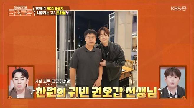 이 남성의 정체는 이찬원의 고등학교 3학년 담임 선생님이었다. 이찬원은 "제 인생을 송두리 채 바꿔주신 고등학교 3학년때 담임 선생님이자 제 은사님 권오갑 선생님이다"라고 소개했다. 이어 "좋아하는 선생님 따라 과목을 좋아한다고 하지 않냐, 이 선생님 덕분에 고등학교 3년 내내 사회 과목을 한순간도 1등을 놓쳐 본 적이 없다"라고 고백했다. 그는 사회 과목에서 전교 1등을 놓치지 않았다고 밝혀 감탄을 자아냈다.