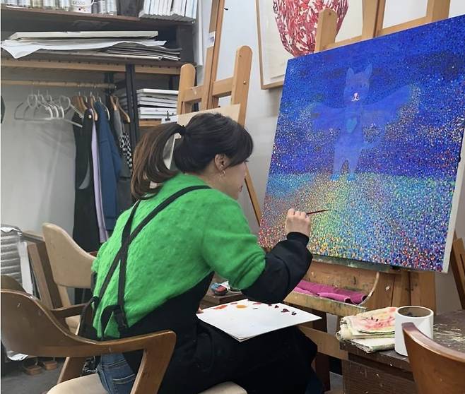 공개된 사진 속 하희라는 밝은 초록색 니트를 입고 있으며 머리카락을 질끈 묶은 헤어스타일을 한 채로 오직 그림 그리기에만 열중하고 있다.