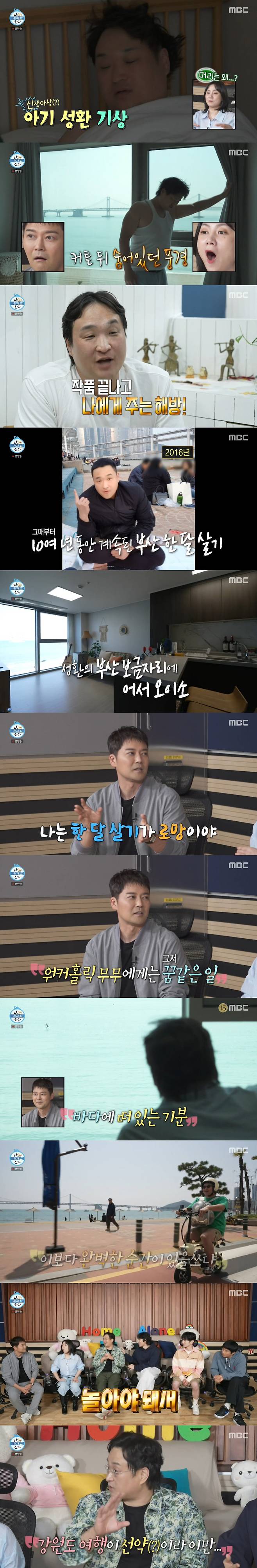 이날 구성환은 집이 아닌 다른 곳에서 눈을 떴다. 그때 커튼 뒤 숨겨있던 풍경인 시원한 바다가 공개됐고, 다름 아닌 부산 광안리였다.
