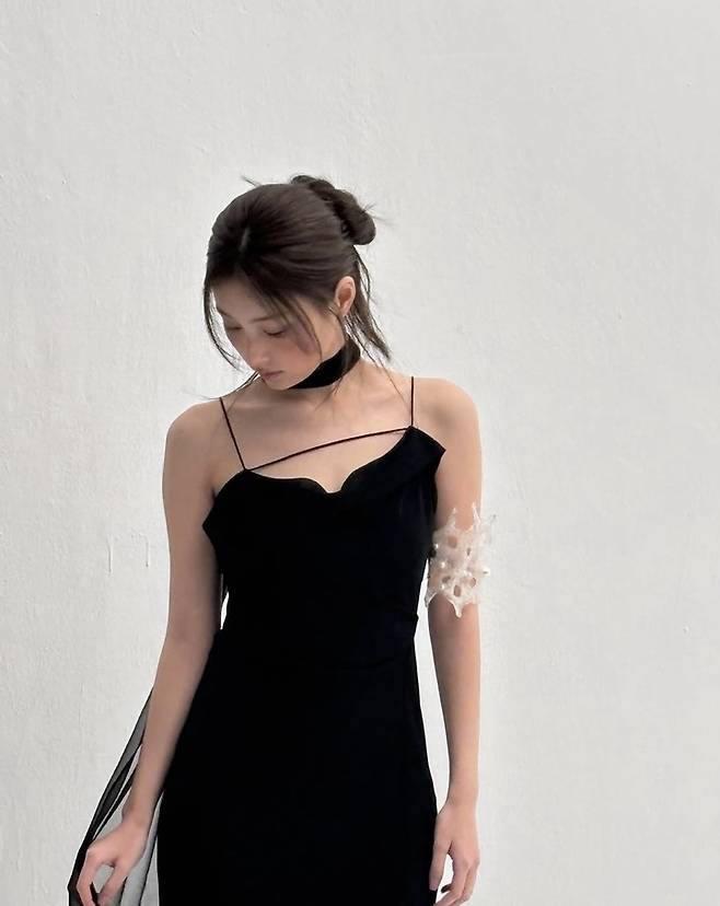 드레스는 슬리브리스 스타일로, 심플하면서도 섬세한 디테일들이 살아있는 모습이다. 얇은 스트랩과 드레이프 네크라인은 여성스러운 무드를 연출하며, 밑단의 러플 디테일을 통해 우아한 느낌도 연출했다. 이에 맞춰 드레스와 동일한 소재로 된 긴 블랙 스카프를 초커 처럼 착용해 전체적인 스타일을 더욱 고급스럽게 완성했다. 힐 또한 블랙 컬러로 맞춰주며 전반적으로 모던하고 클래식한 무드를 이어갔다.