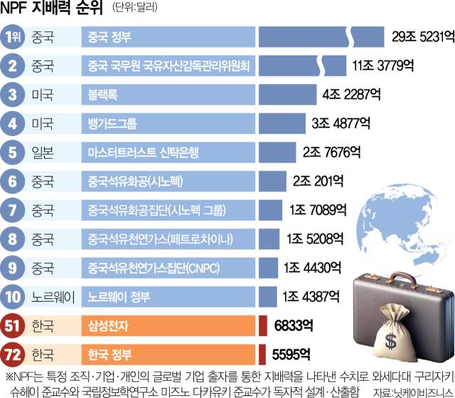 NPF 세계 랭킹에서 압도적 1위는 중국 정부로 확보하고 있는 기업들의 경제적 가치만도 29조 5231억 달러(약 4경 2466조 원)에 달했습니다. 중국 정부가 직접 지분을 소유하는 방식과 자회사·손자회사가 지분을 확보하는 방식을 모두 합친 것으로, 중국 정부의 입김이 실질적으로 작용하는 기업들의 경제적 가치가 4경 원이 넘는다는 의미입니다. 2위 역시 중국 정부의 국유기업을 관리하는 국무원 국유자산감독관리위원회(11조 3779억 달러)가 차지했습니다. 상위 10위권에서 3위(미국 블랙록), 4위(미국 뱅가드), 5위(일본 마스터트러스트신탁은행), 10위(노르웨이 정부)를 제외하고 6곳이 모두 중국 소속입니다. 전문가들은 중국이 특정 국가나 지역의 강점을 파악해 ‘모든 것을 흡수하는’ 전략을 내세워 자본 굴기를 펼치고 있다는 분석을 내놓고 있습니다.