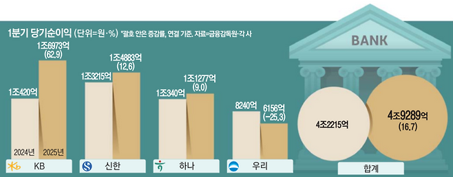 KB·신한·하나·우리 등 4대 금융그룹은 25일까지 공시를 통해 지난 1분기 총 4조9289억원의 당기순이익을 기록했다고 발혔다. 작년 1분기(4조2215억원)에 비해 16% 넘게 신장했다. 증가율 기준으로는 KB금융이 62.9%, 신한지주가 12.6% 순이었고, 하나금융(9.0%)이 뒤를 이었다. 반면 우리금융은 같은 기간 당기순이익이 8240억원에서 6156억원으로 25% 넘게 빠져 ‘나 홀로 역성장’을 기록했다. 4대 금융 외에 IBK기업은행도 이날 실적발표를 통해 1분기 순이익이 전년 동기 대비 3.8% 높아진 8142억원을 기록하고 설명했다.