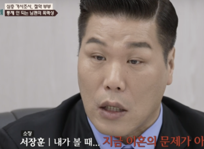 서장훈은 내내 "이혼의 문제가 아니다. 치료와 분리가 시급하다"며 남편에게 병원 치료를 받을 것을 강력히 권유했다. 이혼보다 병원 치료와 분리 조치가 우선이라는 것. 그는 "이렇게 되면 큰일 난다. 이혼이 문제 아니라 폭력과 협박이 문제"라며 남편을 심각하게 지적했다.