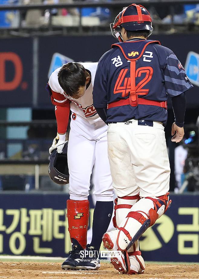 인사를 마친 김민석은 땅볼을 날린 뒤, 헤드퍼스트 슬라이딩으로 1루를 향해 악착같이 달려들었다. 하지만 그 타구는 우연처럼 트레이드로 팀을 맞바꾼 유격수 전민재에게 향했다. 전민재는 재빠르게 1루로 송구했고 간발의 차로 김민석은 아웃됐다.