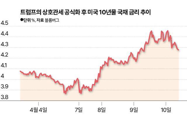 트럼프가 지난 2일(현지시간) ‘미국 해방의 날’이라며 상호관세 부과를 공식화한 직후만 해도 시장금리의 벤치마크로 통하는 10년 만기 미 국채금리는 4% 안팎에서 안정적인 흐름을 보였다. 하지만 상호관세가 ‘협상용’이 아닐 수 있다는 인식이 확산된 7일 오후부터 급등하더니 발효일인 9일에는 4.58%까지 치솟았다. 증시의 변동성이 커지면 대표적 안전자산으로 꼽히는 미 국채에 대한 수요가 늘어 금리가 낮아질 거란 ‘교과서적인’ 예상이 빗나간 것이다.