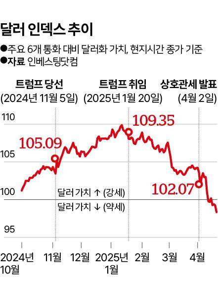 실제로 올해 들어 뉴욕 증권시장에선 스탠더드앤드푸어스(S&P) 500지수가 12% 넘게 하락했고, 나스닥시장도 20% 가까이 빠졌다. 또 유로화∙엔화 등 주요 6개국 통화 대비 달러 가치를 나타내는 달러인덱스는 연초 대비 9% 넘게 떨어지면서 최근엔 4년 만에 100선 밑으로 내려갔다. 여기에 트럼프가 물가 잡기의 요체로 삼고 있는 10년물 미 국채금리도 상호관세 부과가 현실화하면서 급등했다.