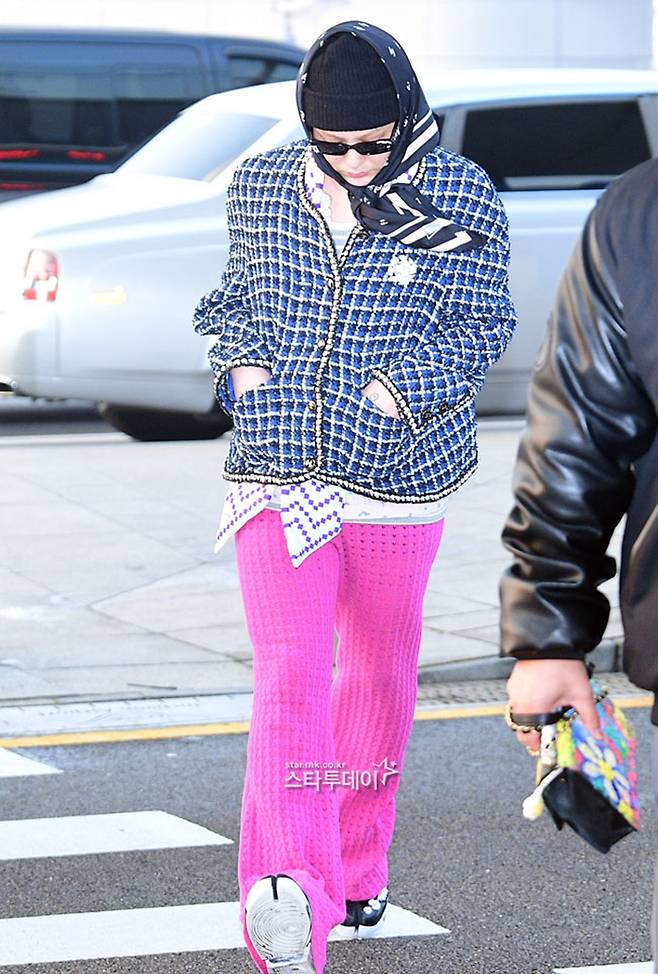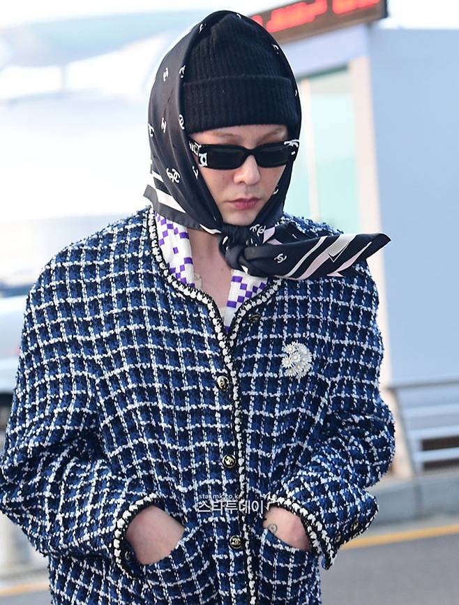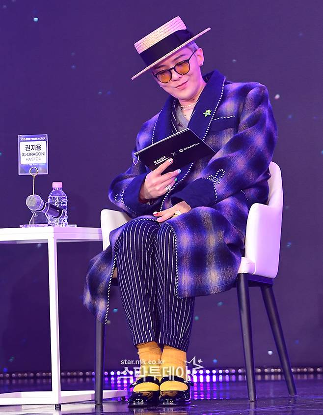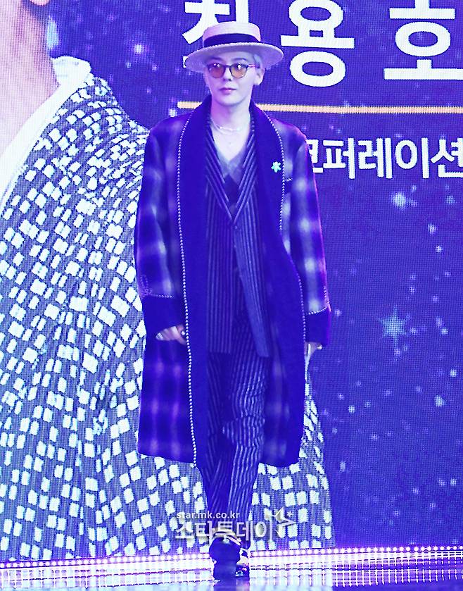 퍼플 체크무늬 롱 코트와 세로 스트라이프 팬츠로 도시적인 분위기를 연출한 지드래곤은 보터 햇 스타일의 파나마 모자와 옐로 틴트 선글라스로 클래식한 예술가의 모습을 자랑했다.