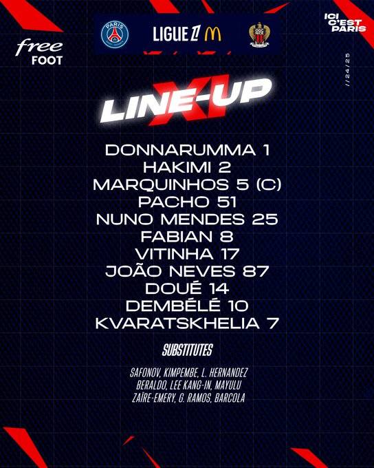 루이스 엔리케 감독이 이끄는 PSG는 4-3-3 포메이션으로 나섰다. 잔루이지 돈나룸마 골키퍼가 골문을 지킨 채, 수비진에는 아슈라프 하키미, 마르키뉴스, 윌리안 파초, 누노 멘데스가 배치됐다. 중원에는 파비안 루이스, 비티냐, 주앙 네베스가 포진했고, 최전방 스리톱에는 흐비차 크바라츠헬리아, 우스만 뎀벨레, 데지레 두에가 선발 출전했다.