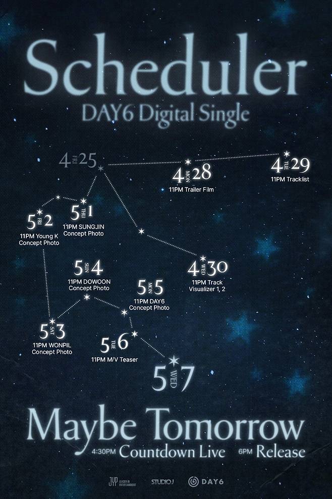 데이식스는 다음 달 7일 새 디지털 싱글 '메이비 투모로우'(Maybe Tomorrow)를 발표한다. 이에 앞서 개인 포스터와 스케줄러를 공개했다.