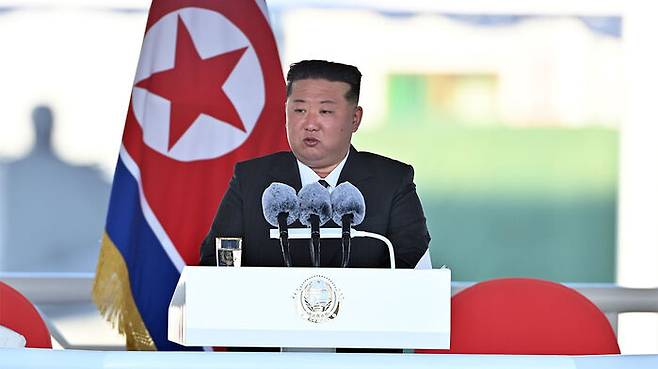▲ 북한 김정은 국무위원장이 지난 25일 남포조선소에서 열린 5,000t급 신형다목적구축함 '최현호' 진수식에 참석해 연설하고 있다.