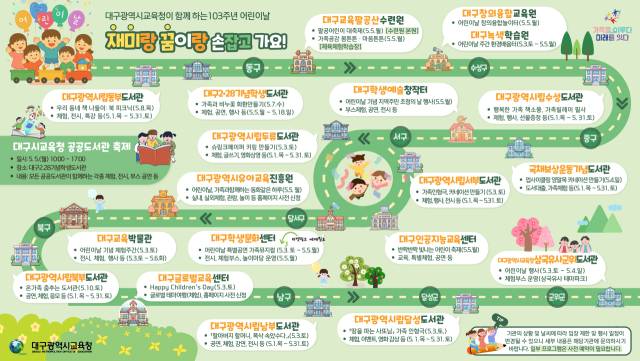 대구시립도서관 10곳은 가족필사 엽서 꾸미기 등 가족과 함께하는 책 놀이 활동과 독서 퀴즈, 인형극, 각종 전시 등 각 도서관마다 어린이의 인문․예술적 소양을 키울 수 있는 특색있는 체험활동 프로그램을 운영한다. 5월 5일에는 2·28기념학생도서관에서 '공공도서관 축제'가 열린다.