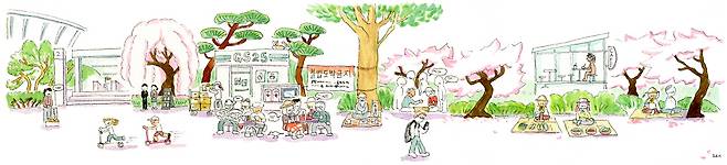 벚꽃은 마지막 꽃잎을 흩날리고, 틈새로 나무에 점점이 돋아나는 연두색 새싹까지 더없이 아름다운 풍경이다. 노점 할머니는 선캡을 벗고 흰머리를 손으로 슥슥 빗어넘겼다. 그리고 몸을 가볍게 흔들며 비처럼 내리는 벚꽃잎을 바라본다. 잘 들리지 않는 대화가 이어진다. 웃음소리도 들리고 가끔 “캬~”하는 감탄의 소리도 들린다. ‘평온한 한때’라는 건 바로 저런 걸 두고 말하는 걸까?