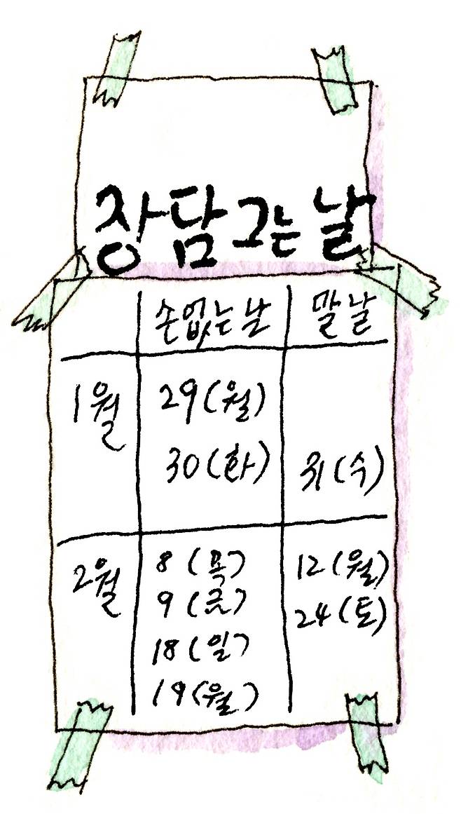 이게 붙어 있던 곳은 된장과 고추장을 파는 집이다. 빵집에서 빵 나오는 시간을 적어놓은 건 흔히 본다. 정육점에서 소 잡는 요일을 간판에 새겨 놓은 것도 본 적 있다. 하지만 장 담그는 날을 따로 알려주는 건 처음 봤다. 더 신기한 건 그날이 바로 ‘손 없는 날’이라는 거다. 손 없는 날에 이사하는 건 나도 안다. 이때 이사를 하면 가격이 더 비싸다. 그런데 손 없는 날과 고추장의 상관관계는 도통 모르겠다.