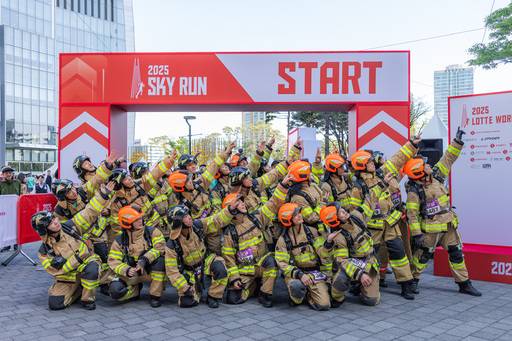 ‘2025년 초고층 건축물 구조대원 특별구조훈련’ 차원에서 대회에 참가한 소방관들은 현장에서 박수를 받았다. 서울 구로·동작·서대문·은평소방서 등에서 25명이 나서 산소통 등 무게 20㎏ 장비를 차고 123층까지 올랐다. 소방관들과 함께 계단을 오른다는 생각에 다른 참가자들은 ‘든든하다’고 반응했다. 시민들은 ‘멋있다’며 엄지를 들었다. 몇몇 소방관은 대회에 참가한 아이들과 기념사진도 찍었다. 쑥스러워하던 아이들은 소방관 헬멧을 쓰자 신기해했다.