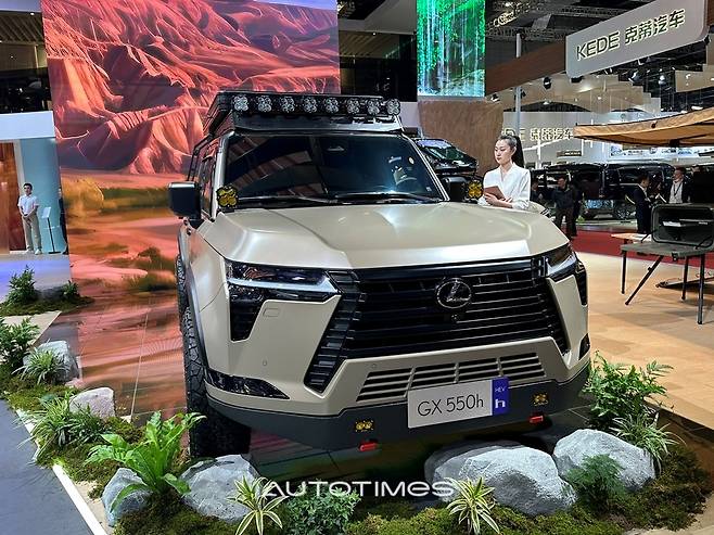 GX550h는 2.4ℓ 가솔린 터보엔진 기반의 하이브리드 시스템으로 시스템 합산 326마력을 낸다. 여기에 기계식 사륜구동과 LSD, 로우레인지 기능을 제공하는 중간변속기 등 험로 주파 기능도 갖추고 있다. 이날 전시되어있는 차는 LX를 통해서도 선보인 바 있는 오버트레일로 험로 주파 능력을 더욱 강화한 트림이다.