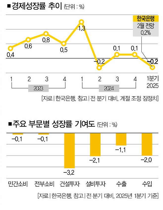 끝내 1분기 경제성장률이 마이너스를 기록했다. 비상계엄 후폭풍으로 소비가 급랭한 데다 도널드 트럼프 미 행정부가 촉발한 글로벌 관세전쟁 쇼크가 겹친 결과다. 이로써 우리나라 경제는 네분기 연속, 사실상 1년간 '제로(0) 성장'을 했다.