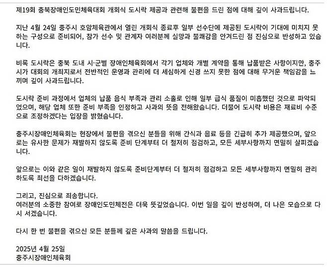충주시 장애인체육회 "개회식 도시락 품질 미흡 사과"