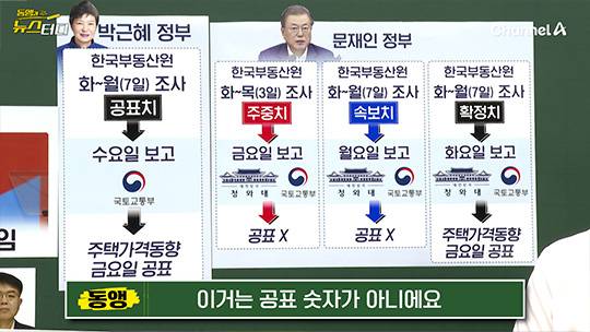 화~월요일 일주일 치 조사 후 수요일에 국토부에 알려주던 걸, 화‧수‧목 3일을 조사하고 금요일에 ‘주중치’라는 이름으로 1차 보고를 하게 합니다. 전에는 국토부만 보고를 받았는데, 청와대까지 보고하라고 하죠. 이건 공표될 숫자가 아닙니다. 그다음 월요일에는 화~월 조사한 내용을 속보처럼 바로 월요일에 ‘속보치’로 보고하라고 합니다. 역시 청와대와 국토부가 보고를 받아요. 이 역시 확정된 수치가 아닙니다. 주중치와 속보치라는 없던 걸 만들어 보고를 받고, 확정된 수치는 ‘공표치’로 화요일에 보고하게 했습니다. 그리고 금요일에 공표합니다.