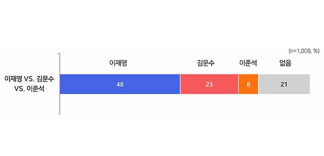 한동훈 후보와의 3자 대결에선 이재명 47%, 한동훈 21%, 이준석 6%, 김문수 후보와는 이재명 48%, 김문수 23%, 이준석 8%, 안철수 후보와는 이재명 47%, 안철수 16%, 이준석 8%로, 이 후보가 3명의 국민의힘 경선 후보보다 두 배 이상 우세한 것으로 나타났습니다.