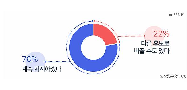 '지금 지지하는 후보를 계속 지지하겠느냐'는 질문에는 '계속 지지하겠다' 78%, '다른 후보로 바꿀 수 있다' 22%로, 계속 지지하겠다는 응답이 가장 많은 진보 진영 후보는 이재명 후보 88%, 보수 진영 후보는 한동훈 후보 80%였습니다.