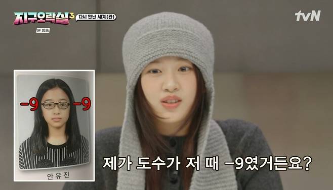 이에 안유진은 "저 때 도수가 -9였다. 저 안경을 써야되는 거냐. 교정도 되돌려야 한다"면서 진지하게 반응했다.