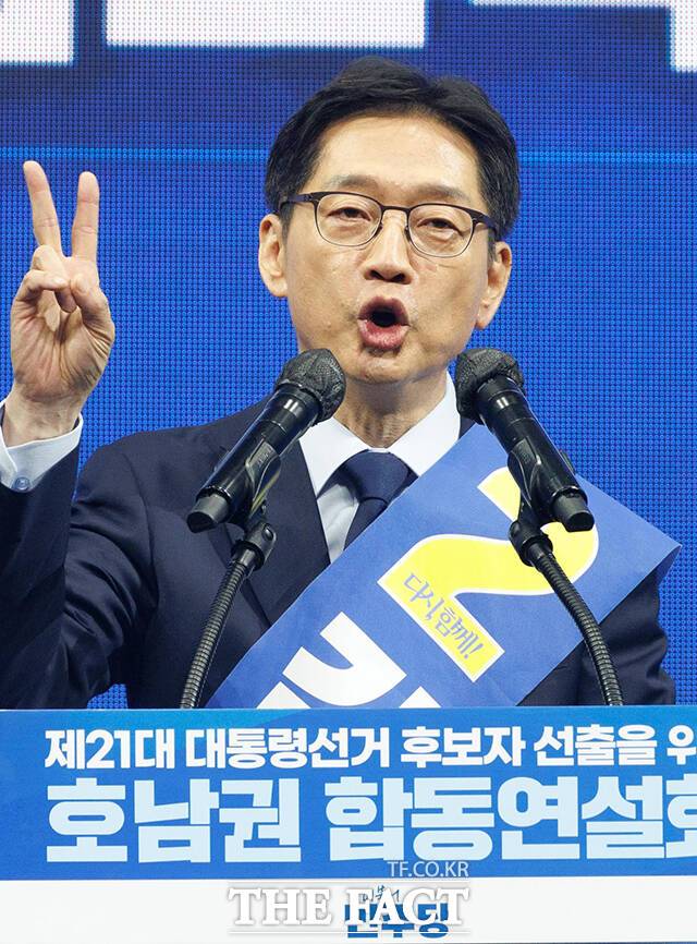 [더팩트ㅣ광주=장윤석 기자] 김경수 더불어민주당 대선 경선 후보가 26일 오후 광주 서구 김대중컨벤션센터에서 열린 호남권 합동연설회에서 정견발표를 하고 있다.