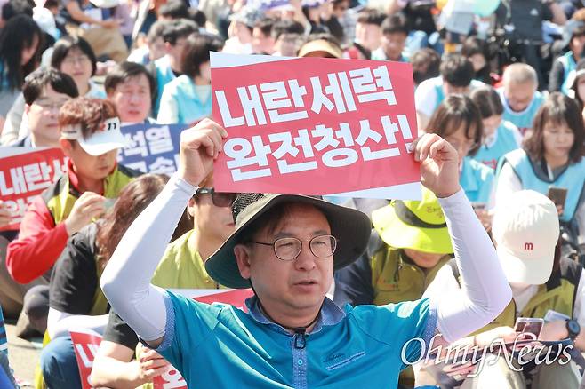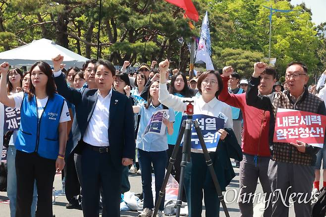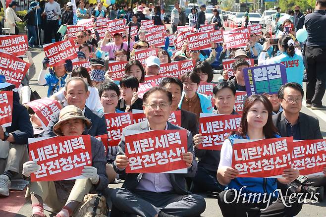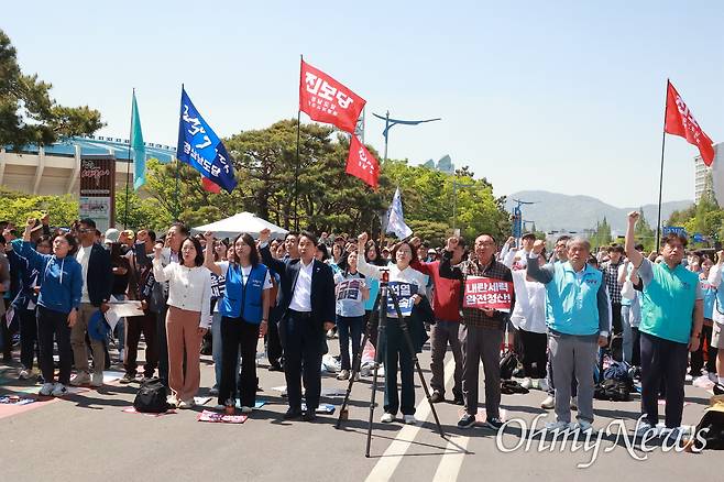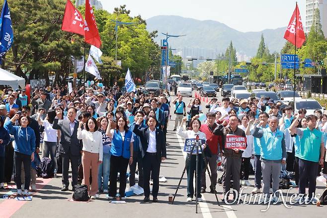 | ▲ 4월 26일 오후 창원운동장 만남의광장 앞 도로에서 “내란완전종식, 민주헌정 수호, 새로운 대한민국 건설, 경남 야4당 공동행동”에 이어 “내란세력 완전청산, 사회대개혁 실현 경남도민대회”가 열렸다. |